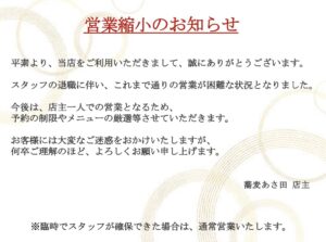平素より、当店をご利用いただきまして、誠にありがとうございます。 長らく昼飲みの営業をしてまいりましたが、この度夜のみの営業に切り替えさせて頂きます。 当店のコンセプトである「手打ちそばとお酒を楽しめる空間」をお客様ひと […]