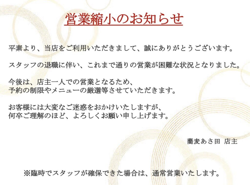 営業縮小のお知らせ